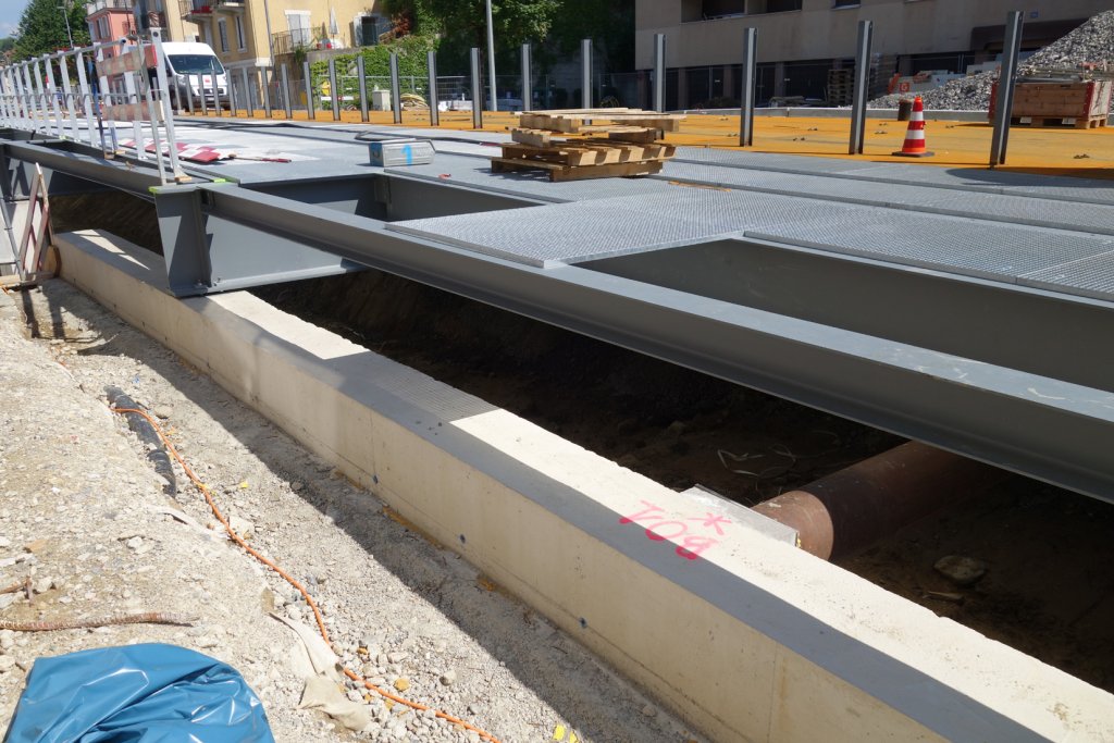 Construction d'un viaduc provisoire pour le passage des trains et autos pendant les travaux