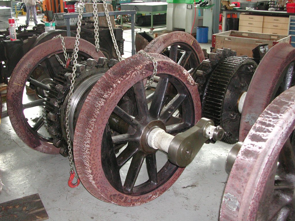 Révision BCFeh 4/4 6 MCM - Les essieux rebandagés en attente de profilage