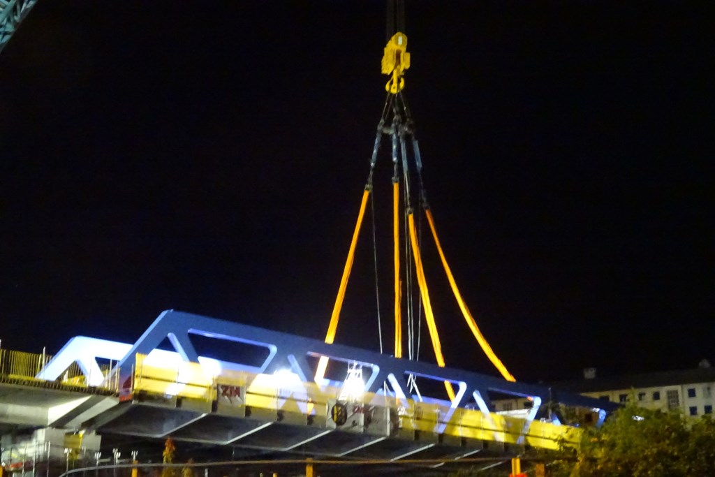 Les câbles sont détendus, le pont est définitivement en place